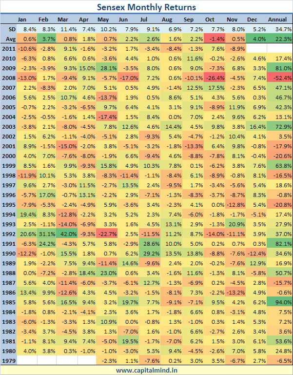 As @chondhe points out on twitter, December has traditionally been good for the Index, with the last negative December being way back in 2001, and that too less than 1% down. The only bad December for the Nifty was 1994 (but that was the year it started!) The Sensex has however seen a –12% December in 1990.