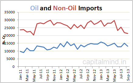 Imports were down 18% from Sep 2012, from $42 bn to $34.4 bn though while exports grew over 11%. Remember, the currency has depreciated over 10% (from 55 in August 2012 to about 61 today).