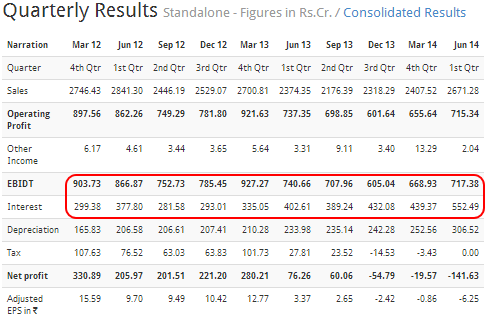 It’s not easy to run this company – they paid over 1800 cr. in interest in the last 12 months, which is a 50% increase from the 1200 cr. in FY13. (Some of the loans are denominated in dollars, which lets them be cheaper) In fact, in the last quarter, they earned an EBIDTA of Rs. 700 cr. of which Rs. 500 cr. was paid out as interest alone! (Look at the red box above – see how much more of a percentage of profit the company is paying out as interest)