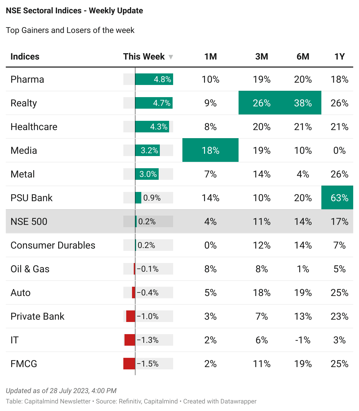 Pharma sector was up 4.8% this week followed by Realty and Healthcare sector. Over all timeframes, the best performing sectors are the ones that are usually out of favour in the markets – Realty, Media and PSU Banks!