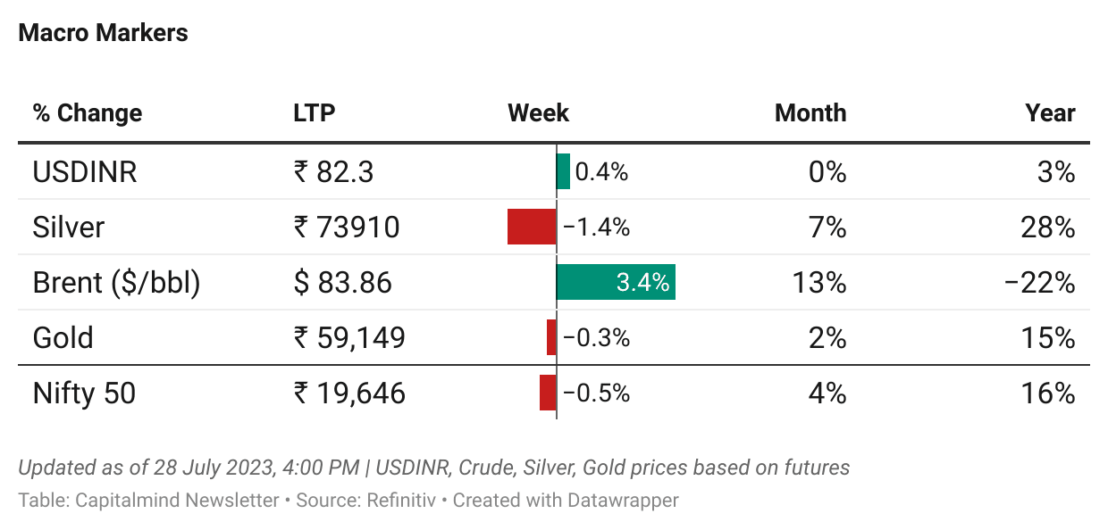 Brent Crude has risen by 13% in the past month and is now trading around $84. Nifty 50, Gold and Silver cooled off a bit this week while USDINR gained a little.